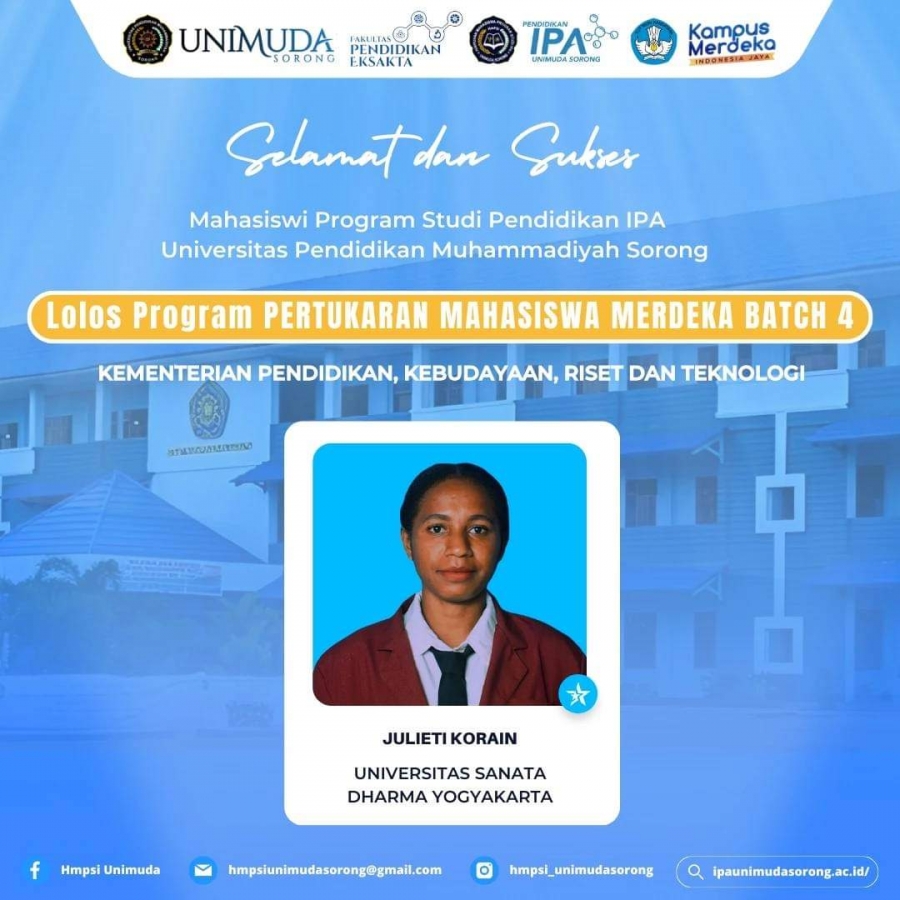 Sorong – Julieti Korain, mahasiswa Program Studi Pendidikan IPA Universitas Pendidikan Muhammadiyah (UNIMUDA) Sorong, berhasil lolos dalam Program Pertukaran Mahasiswa Merdeka (PMM) Batch 4. Julieti ditempatkan di Universitas Sanata Dharma (USD) Yogyakarta.